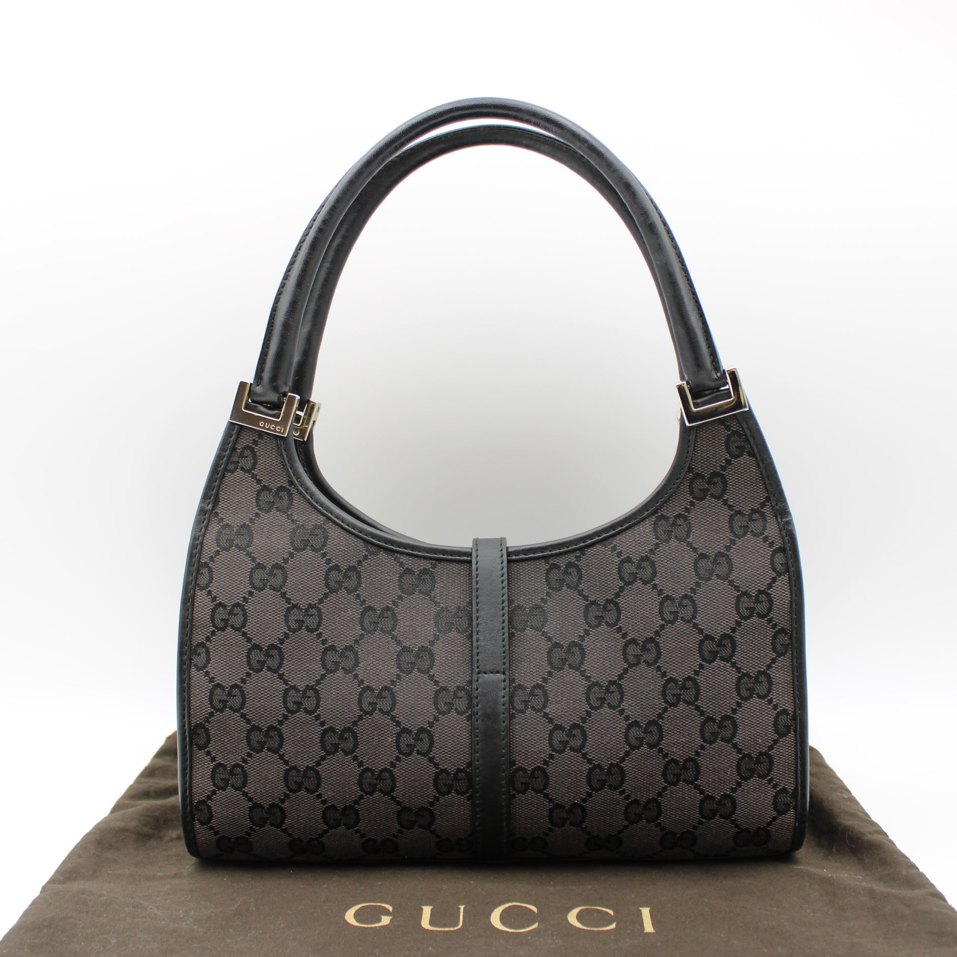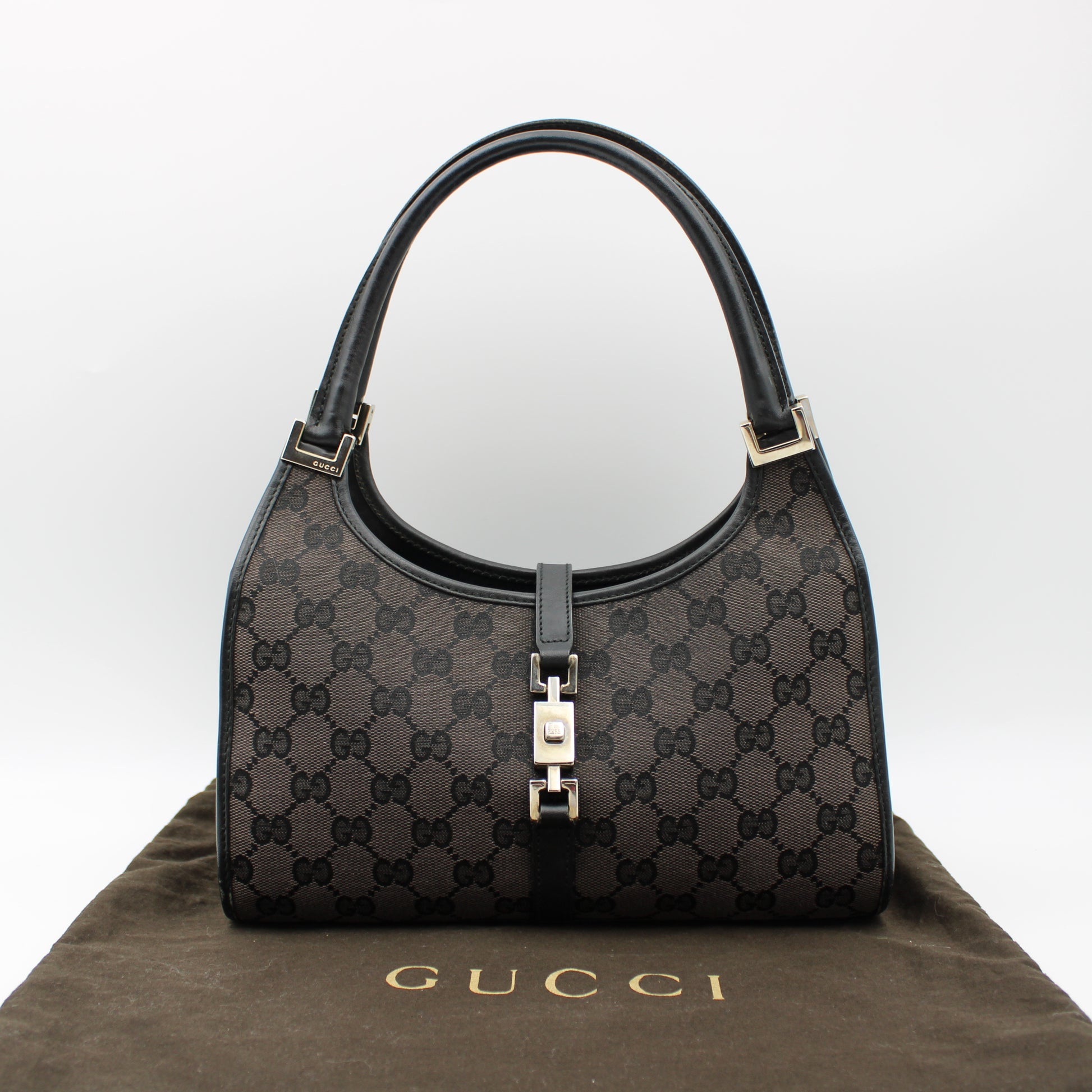 Questa borsa a spalla Gucci GG Jackie è realizzata a mano in tela monogram GG con finiture in pelle nera